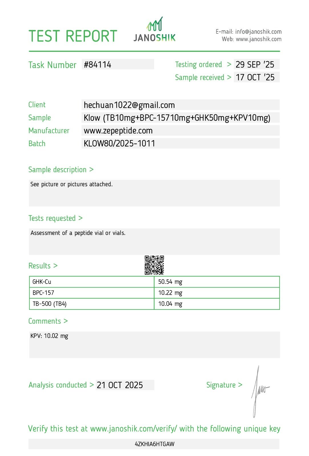 KLOW is a multi-peptide blend studied for its combined effects on tissue repair pathways, inflammatory signaling, and cellular regeneration mechanisms. Comprising GHK-Cu, BPC-157, TB-500, and KPV, preclinical research has explored its potential to influence wound healing processes, collagen synthesis, and immune modulation. ⚠️ DISCLAIMER: This product is intended for research purposes only. Not for human consumption. For use by licensed researchers and professionals only. Keep out of reach of children.